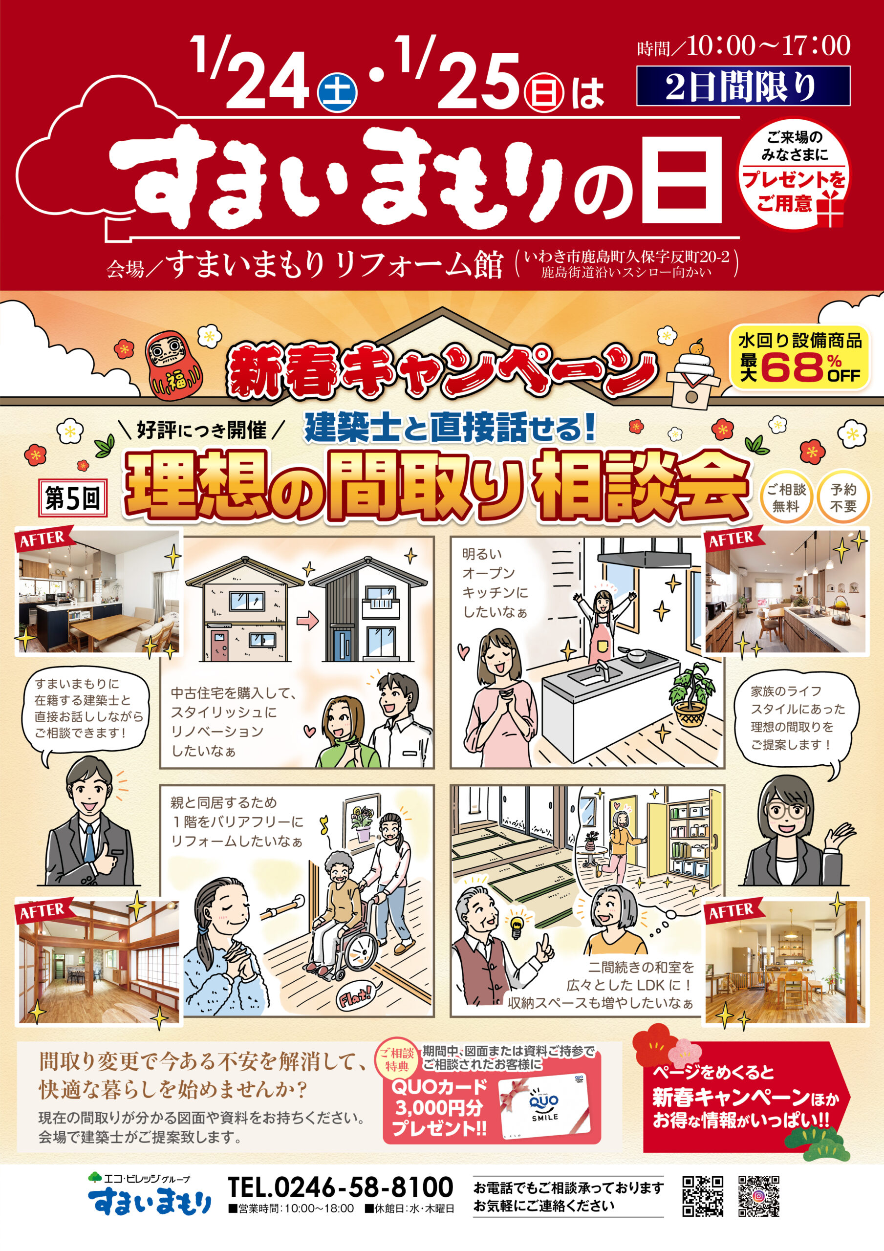 - 1月24日(土)・25日(日) 10:00~17:00 (会場:すまいまもり リフォーム館) 詳しくはこちら >
